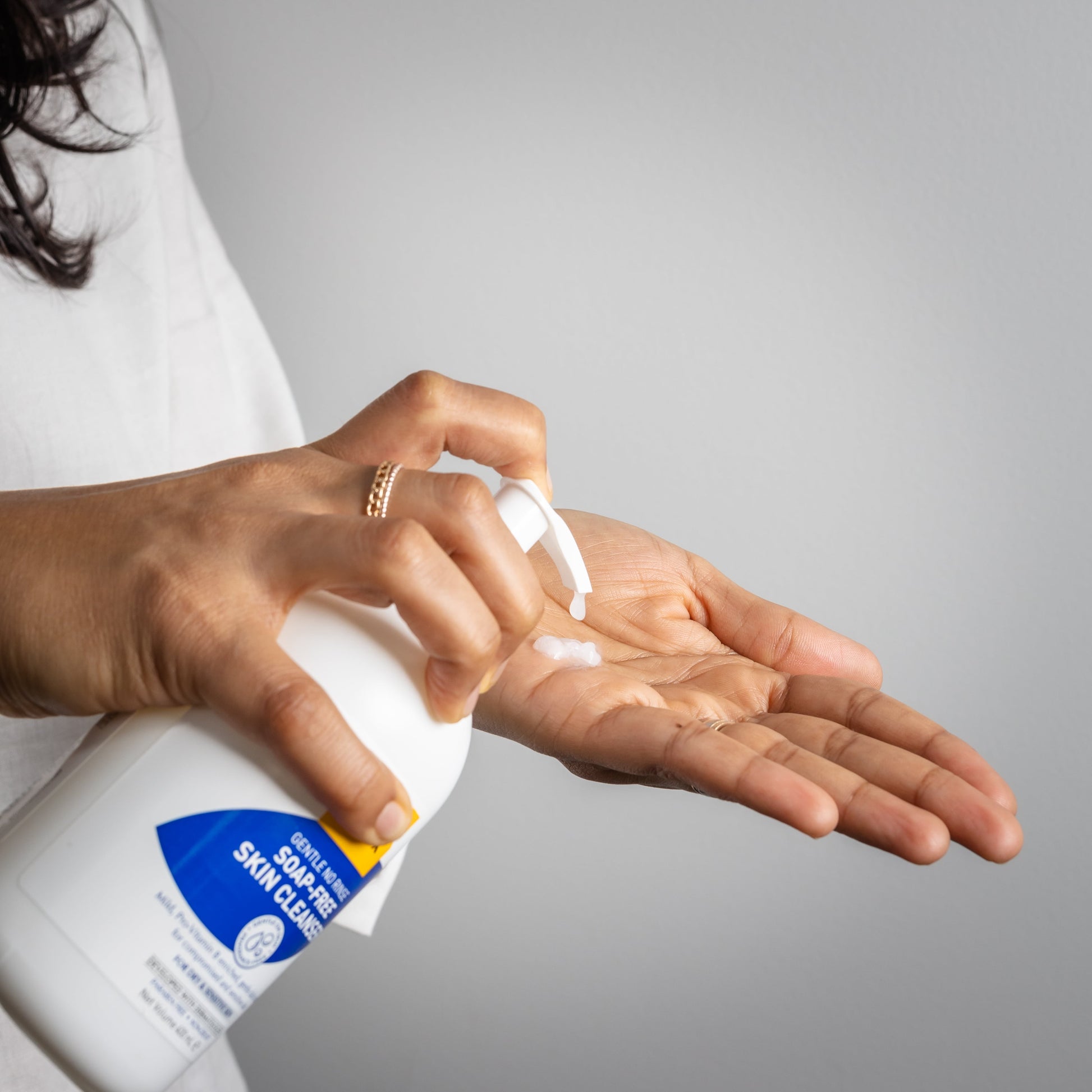 - Apply a small amount of no-rinse cleanser to your dry or damp skin.