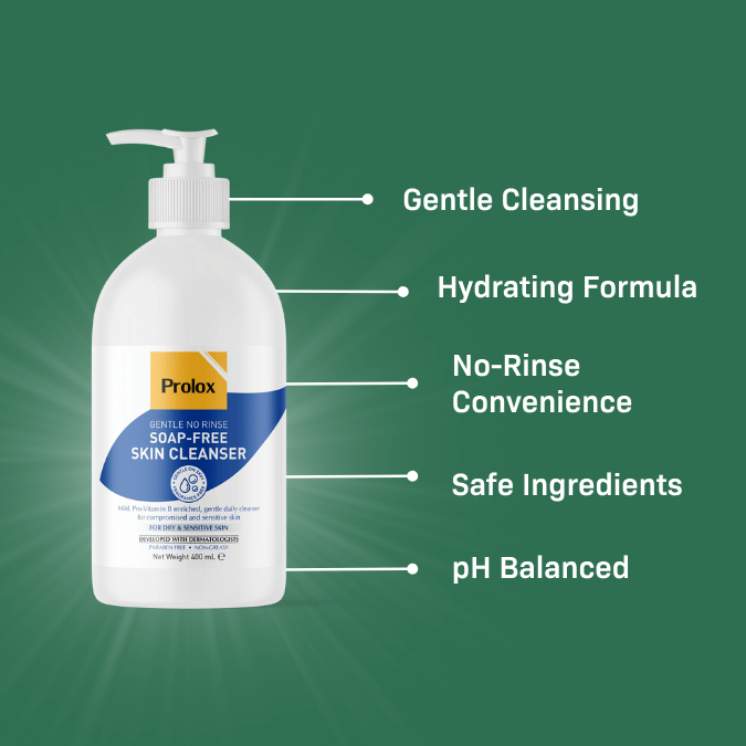 A. Soap-free body cleanser uses gentle, non-alkaline ingredients to gently clean your skin without disrupting its natural pH balance. Regular soaps can strip away your skin’s protective layer, making it dry or tight. Prolox No Rinse Soap-Free Skin Cleanser is beneficial for individuals with sensitive, dry, or eczema-prone skin. It’s also better tolerated by ageing or damaged skin, helping you cleanse without irritation.